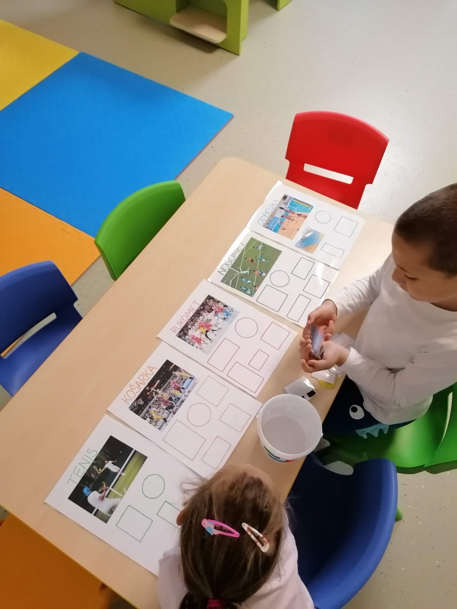 U sljedećim tjednima bavili smo se sportom. Djecu smo upoznali s različitim vrstama sportova putem slikovnih aplikacija od kojih smo napravili plakat, te raznim dječjim knjigama. U suradnji s roditeljima iz naše skupine koji su nam donirali i posudili razno razne lopte i rekvizite za sportske aktivnosti, kao i bijele majice za svoju djecu, mogli smo svakodnevno provoditi tjelesne aktivnosti u dvorani i vanjskom prostoru vrtića. Aktivnosti s kojima smozapočeli u našoj sobi dnevnog boravka bile su stolno manipulativne igre poput igre memori karticama, kartice za savladavanje pojmova veliko-srednje-malo, uparivanje sportova i sportske opreme, usavršavanje vještine rezanja škaricama. Isto tako djeci je pružena mogućnost likovnog izražavanja i stvaranja putem modeliranja slanim tijestom,crtanja te izrezivanjem i ljepljenjem kolaž papira. Djeca su se najaviše radovala odlasku u dvoranu gdje su sudjelovali u aktivnostima poput gađanja loptom u metu (ispisani brojevi na zidu), vođenje lopte rukom i gađanje u koš, vođenje lopte nogom i gađanje u gol. Slikovnica o Mari i sportu potakla nas je na promišljanje i jačanje sportskog duha i timskog rada. Pa smo stoga proveli razne natjecateljske aktivnosti kao što su igre štafeta, kuglanje, utrke i slično. Ovim sklopom aktivnosti obilježili smo Međunarodni dan sporta, a u goste su nam stigli i treneri iz NK Barilović. S djecom iz skupina “Točkice” i “Zvjezdice” proveli su razne vježbe.”Točkice” su preskakale ljestvice, igrali lovice, vodili loptu nogom i gađali na gol, te na kraju i zaigrali pravu nogometnu utakmicu. Na kraju, za svoj trud i sportsko ponašanje, djeci su dodijeljene pohvalnice i medalje.