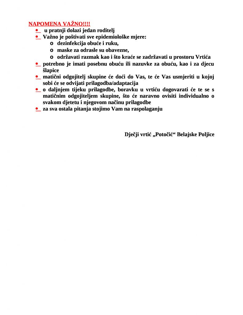 Raspored dolaska novoupisane djece u DV “Potočić” Belajske Poljice za vrijeme adaptacijskog perioda 30.8. i 31.8.2021.