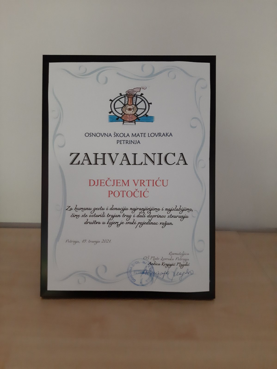 Ovih dana stigla nam je zahvalnica OŠ Mate Lovraka iz Petrinje što nas čini sretnima i ponosnima!