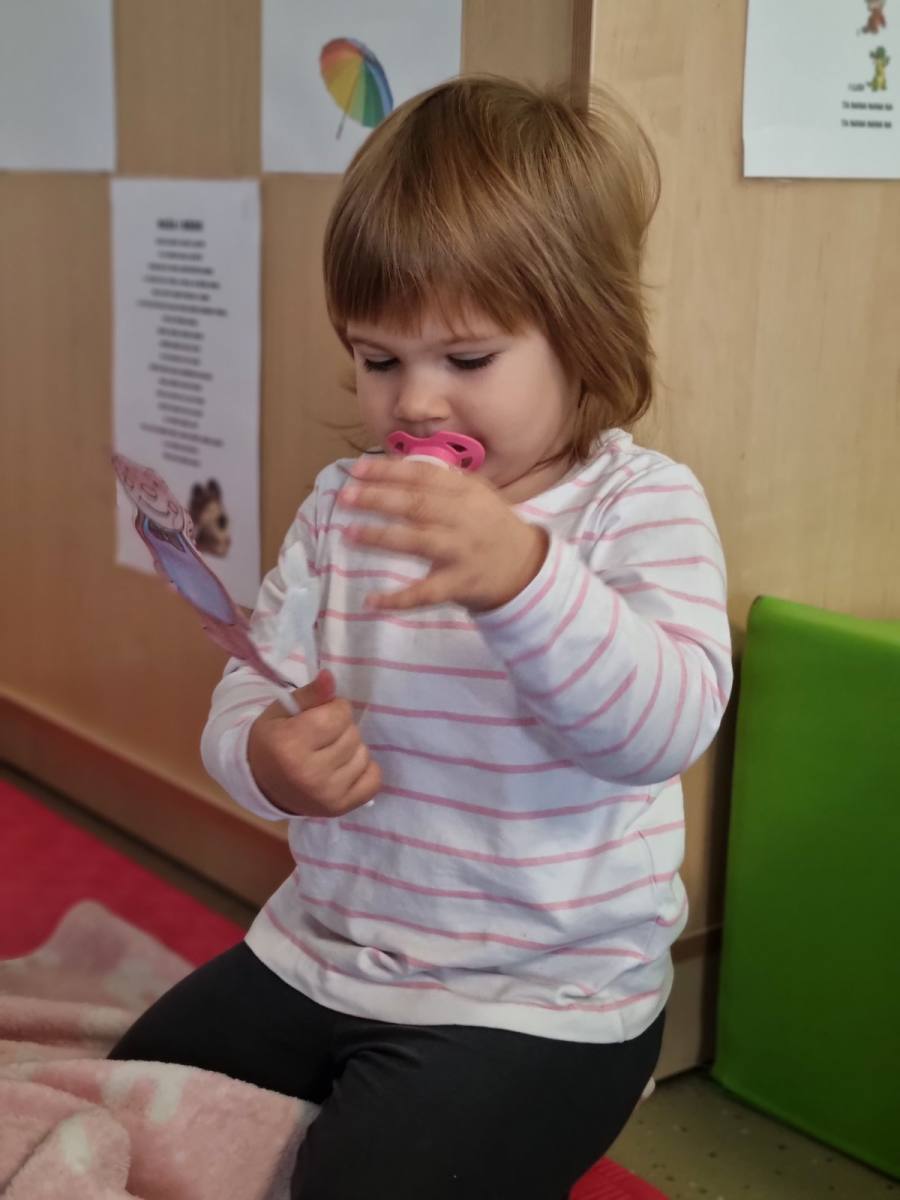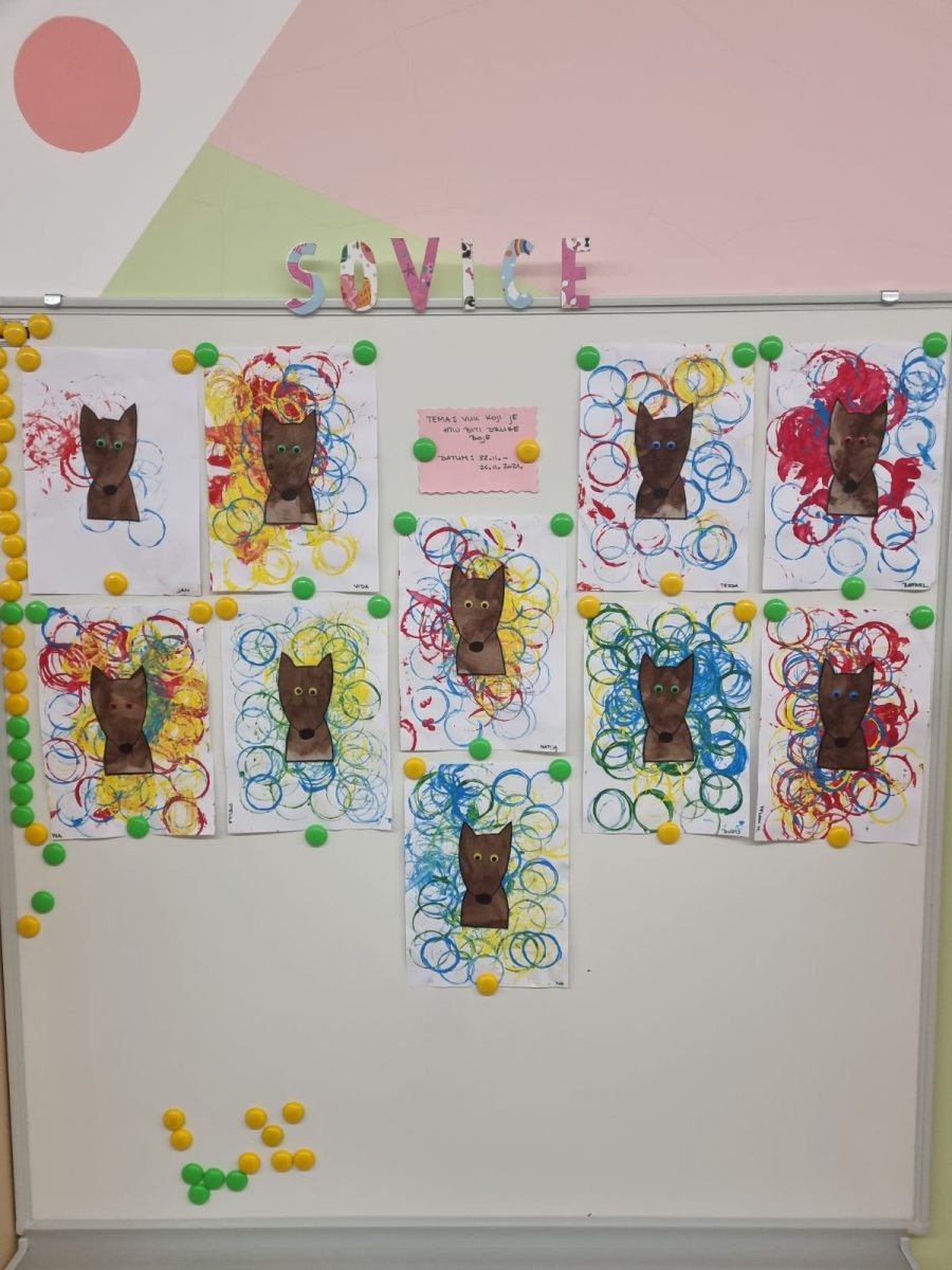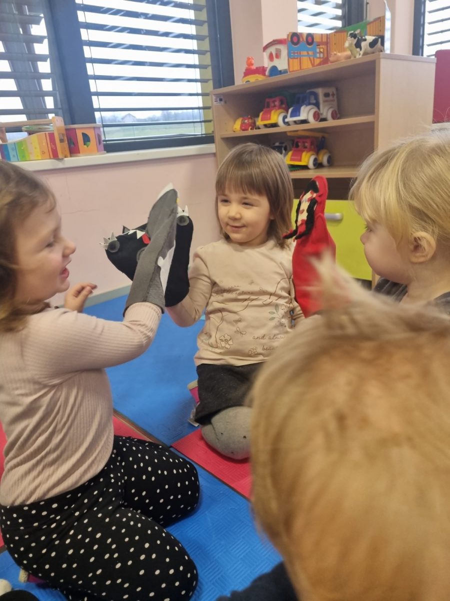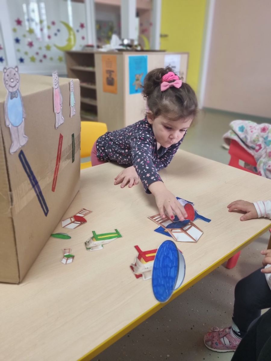 Tako smo i mi Sovice ovaj mjesec krenuli sa bajkama, a prva nam je bila Zlatokosa i tri medvjeda. Osim pričanja priče, slikovnicu smo razgledavali te pokušali uočiti razliku između medvjeda, tanjura, stolice… likovno smo se izražavali radeći, oslikavajući medvjede. Klasificirali smo predmete po boji i veličini. A da priču samo ne pričamo koristili smo štapne lutke koje su pojačale intenzitet priče.