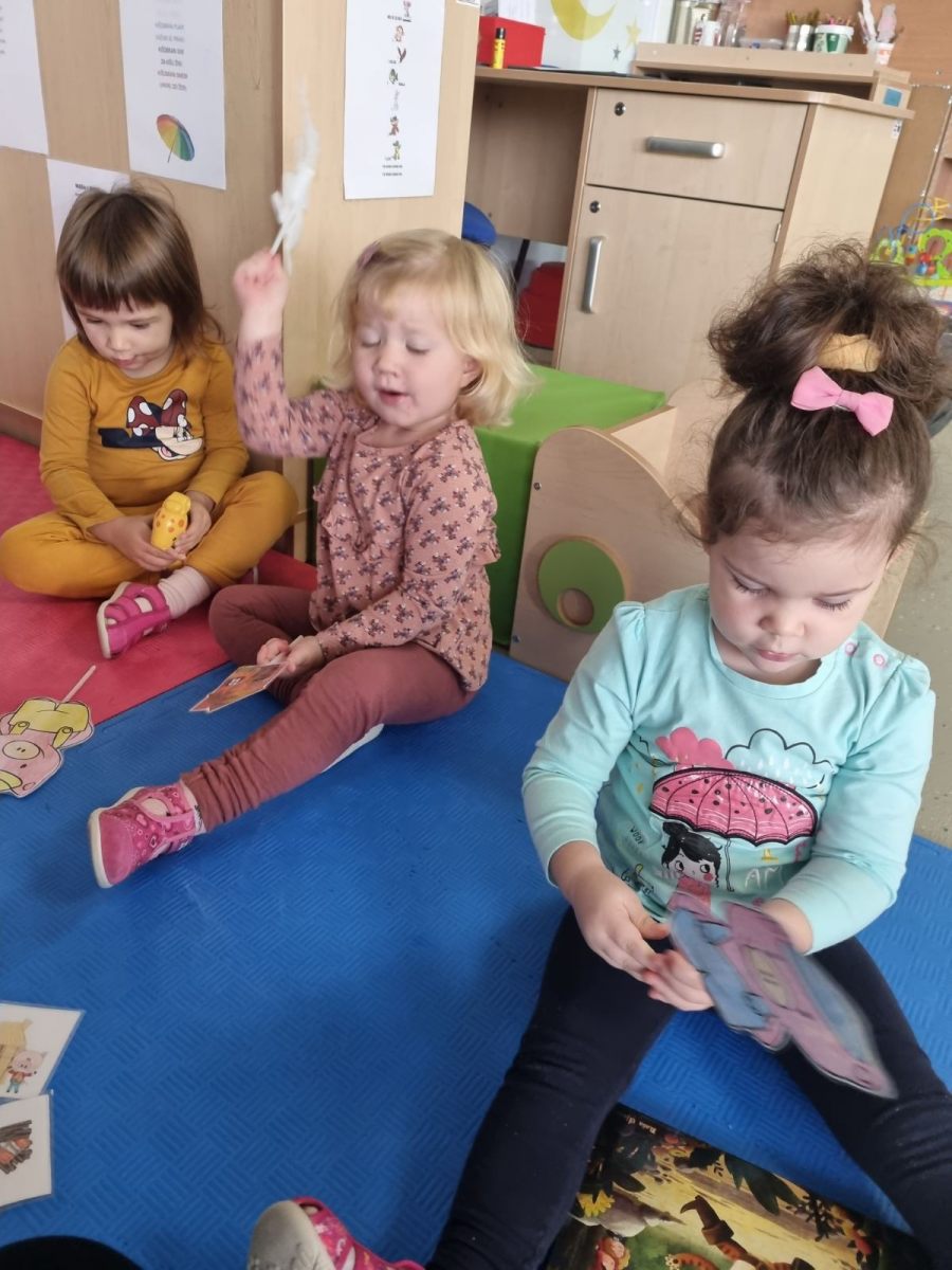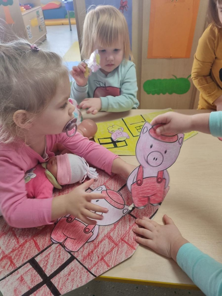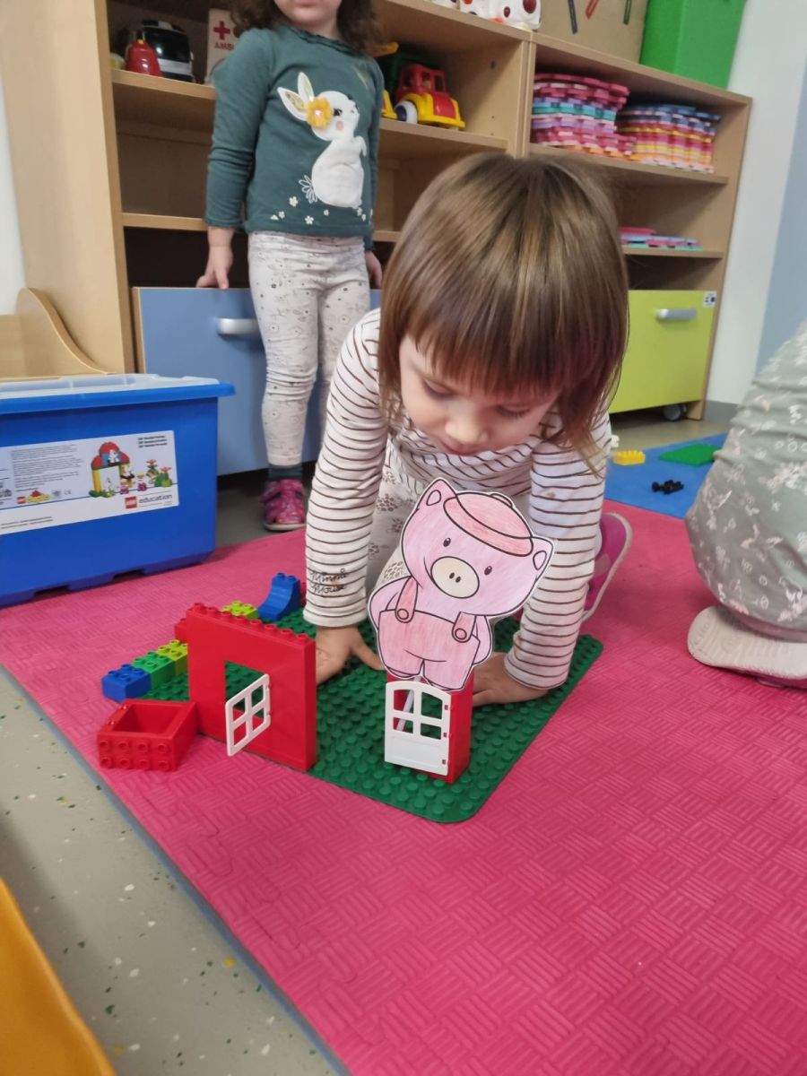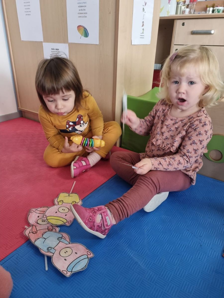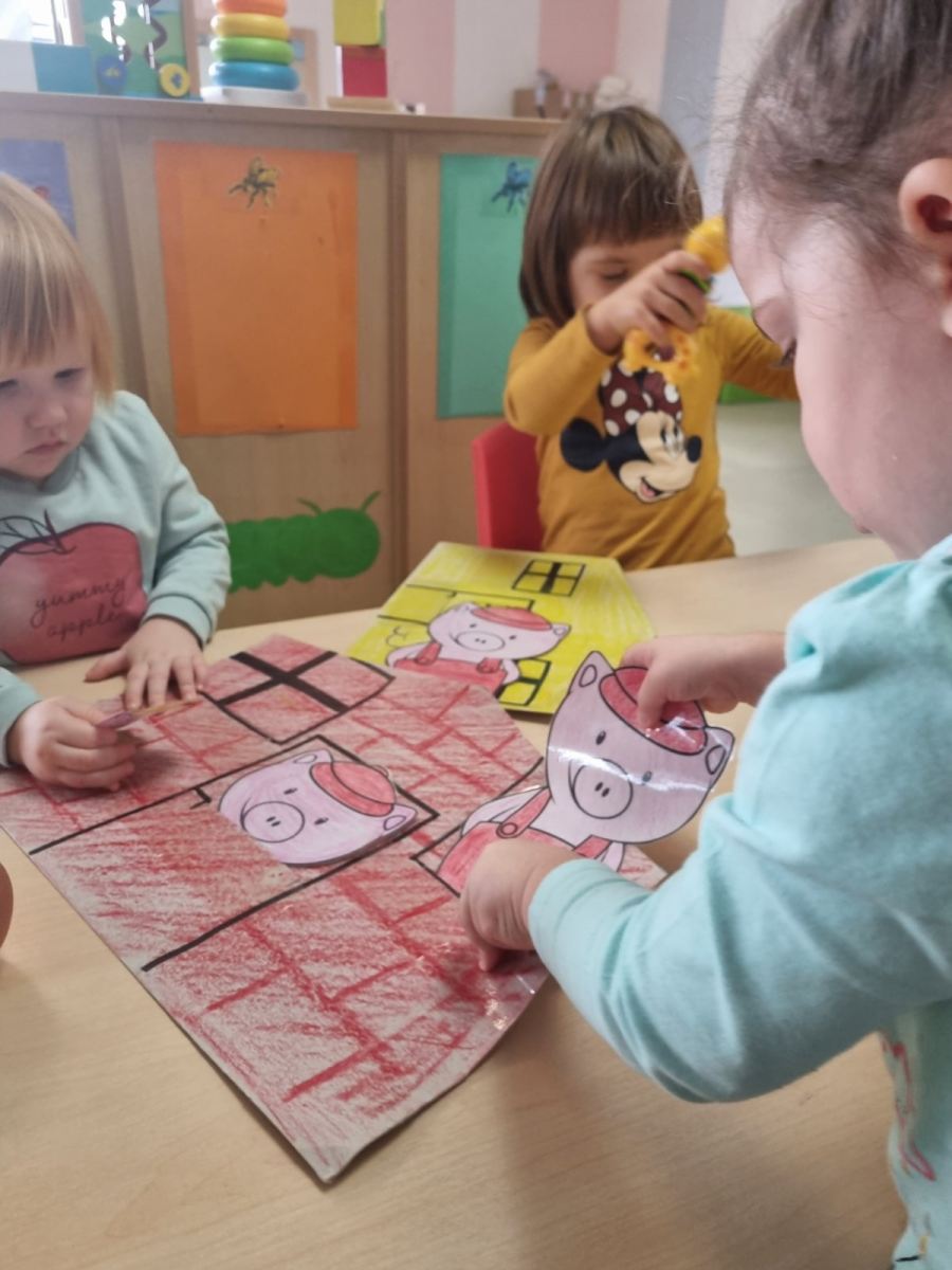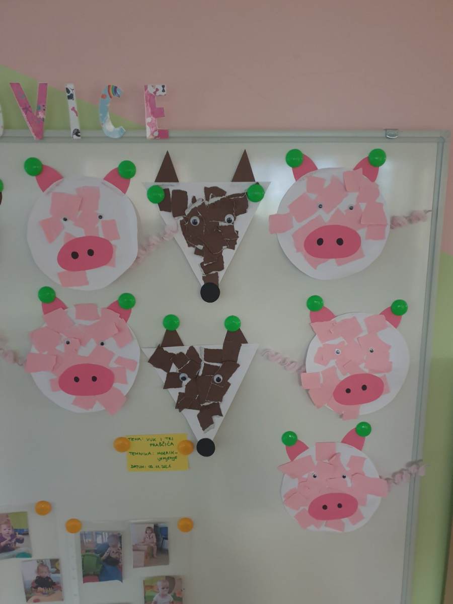 Našem ovogodišnjem projektu „Boje i oblici“ približila nas je priča o Tri praščića. Plošne lutke kao i slikovnica privukle su djecu na pažnju slušanja a stariji su se i sami okušali u pričanju uz pomoć lutkica. U centru gradnje gradili smo kućice za naše praščiće, a da li su dovoljno čvrste testirali smo ih puhanjem kao vuk. Priča nam je osim toga omogućila likovne aktivnosti te stolnomanipulativne (pridruživanje, klasifikacija).