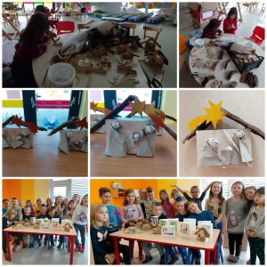 Zajedno s djecom i u suradnji sroditeljima od prirodnih materijala izradili smo božićne jaslice sa Sv. Obitelji koje su djeca zajedno s čestitkom nosila kući.