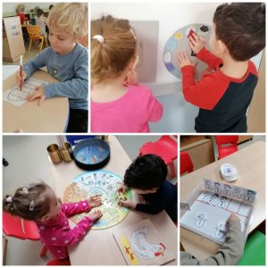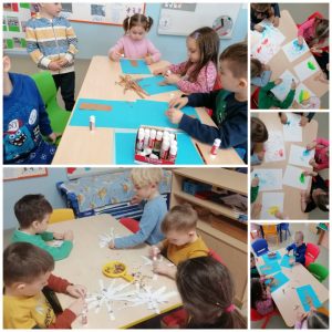 U stolno manipulativnom centru djeci su ponuđeni razni poticaji za razvoj matematičkih vještina, grafomotorike, te vještina početnog čitanja i pisanja. Tu su se još našle puzzle s godišnjim dobima, memory kartice sa snjegovićima kao i uočavanje sličnosti i razlika među njima. U likovnom stvaralaštvu djeca su pokušavala što samostalnije kompozicijski slagati i lijepiti trakice papira kako bi dobili stablo,a zatim su bijelom temperom dodali i dašak snijega. Rezanjem i lijepljenjem trakica izrađivali smo svjetlucave pahuljice snijega, dok smo snjegovića crtali olovkom.