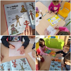 Djecu smo uvele u svijet zanimljivosti i činjenica o ljudskom tijelu putem ilustracija i tekstova iz slikovnica i enciklopedija kao što su: “Ljudsko tijelo”, “Kako radi tvoje tijelo”, ” Zašto moje tijelo ne izgleda kao tvoje?” i sl.