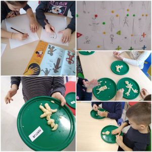 Likovne aktivnosti proveli smo u tehnikama- olovka i modeliranje slanog tijesta ( kostur, ljudsko tijelo).