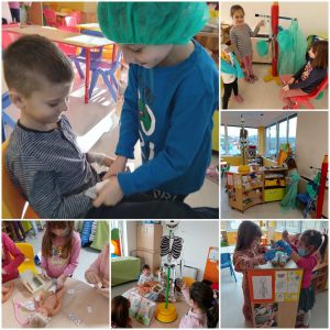 U suradnji s roditeljima sakupili smo puno medicinskog materijala i pribora i oformili centar “Liječnika” kojeg smo tijekom korištenja u igrama uloga (liječnik -pacijent) upoznavali i učili pravilno koristiti.