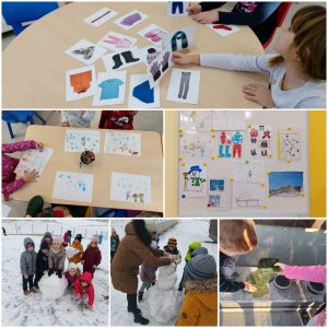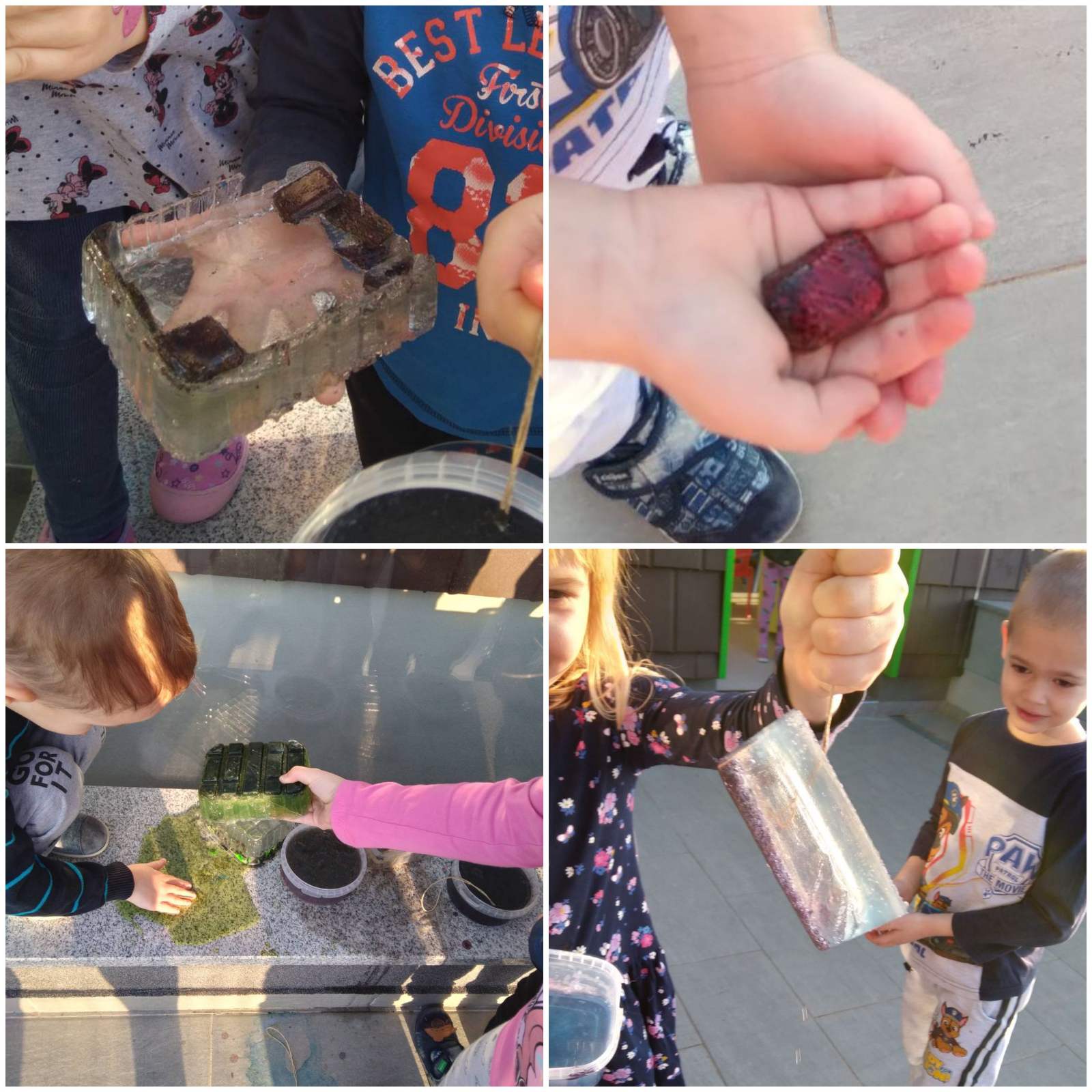 Uočavali smo što se događa kada se voda smrzne u posudici. Bilo je zanimljivo iz posudica vaditi različite komadiće leda s travom, mahovinom ili u boji.