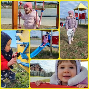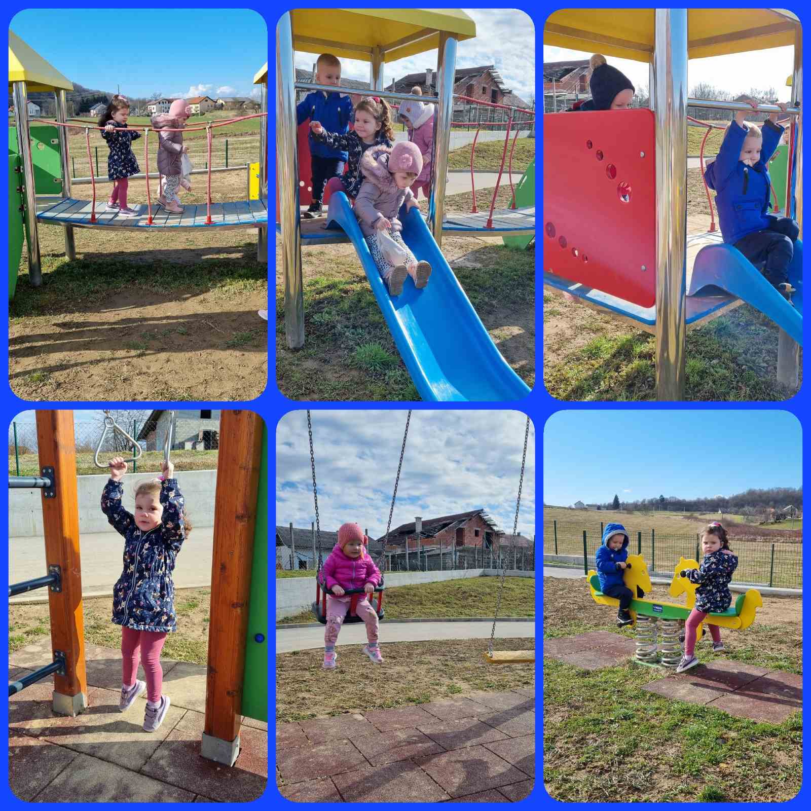 Veljača nam je bila sunčana pa smo iskoristili to lijepo vrijeme i igrali se vani na igralištu. Na igralištu se ljuljamo, spuštamo niz tobogan, klackamo i trčimo, izmorimo i nakon toga lijepo spavamo.