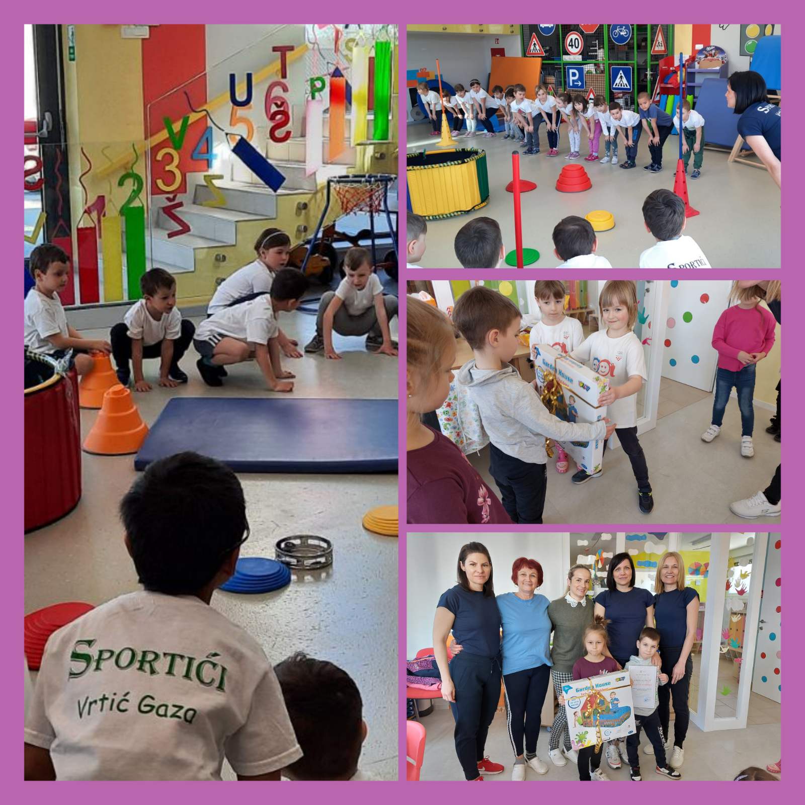 Stvarno je bilo odlično…uživali smo, a nakon napornog vježbanja slijedio je odmor i opuštanje. Prijatelji Sportići prošetali su i do naše sobe, kako bi vidjeli gdje mi provodimo vrijeme u igri, kada nismo u dvorani. Kao sjećanje na posjet našem vrtiću, prigodno smo im uručili poklon, kao maleni znak pažnje, koji će ih moći podsjećati na naše zajedničko druženje, vrijeme provedeno u igri i na naš vrtić.