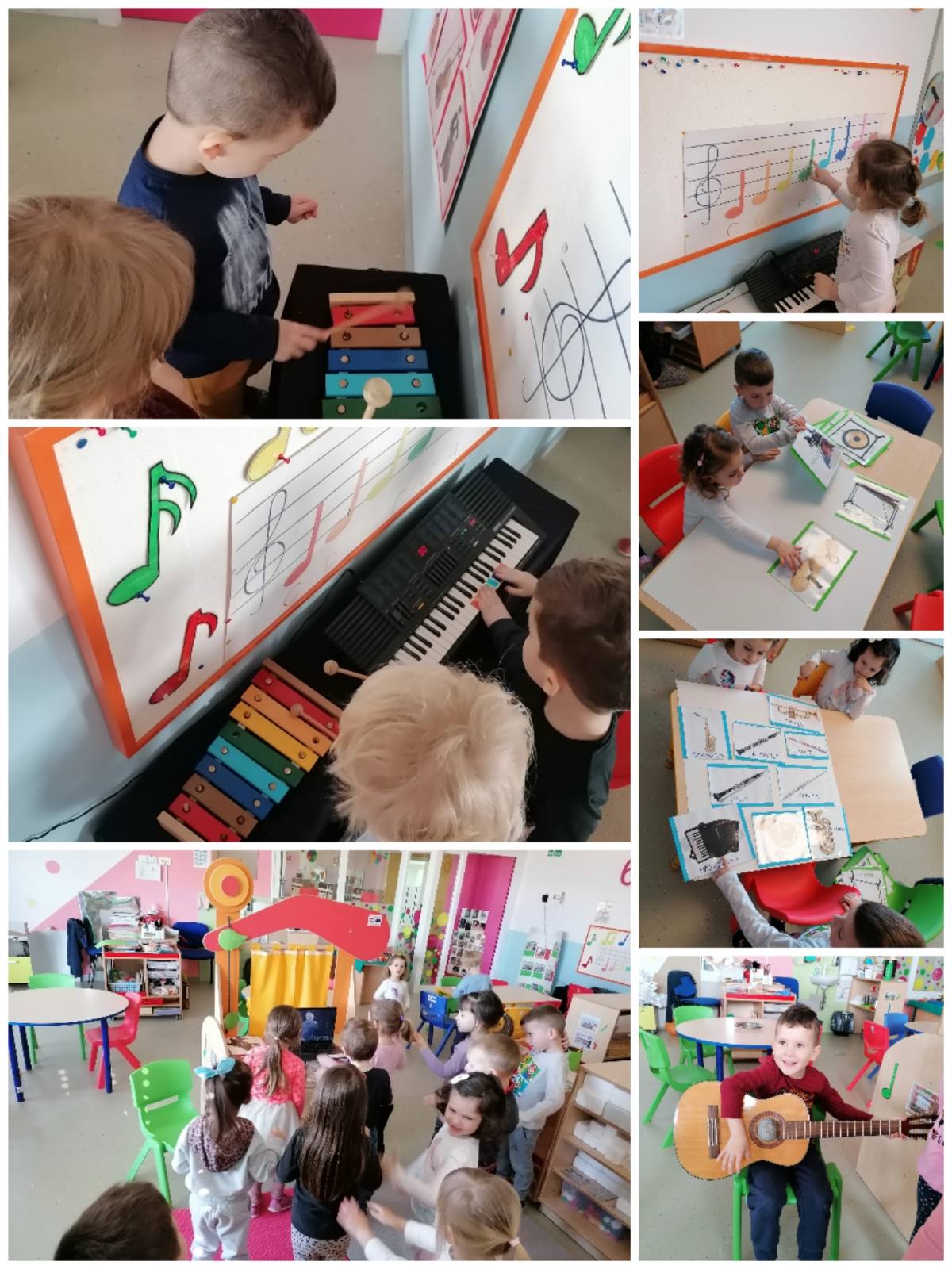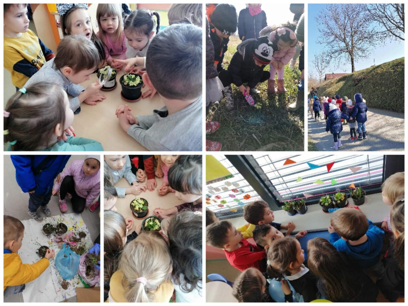 S mjesecom ožujkom polako nam se prišuljalo proljeće. Počeli su se pojavljivati prvi vjesnici proljeća – jaglaci, visibabe i cica mace. U našim Zvjedicama proljeće smo pozdravljali sviranjem i pjevanjem. U našoj sobi dnevnog boravka nalaze se razne udaraljke, sintisajzer, ksilofon i gitara kojima djeca tijekom dana redovito prilaze kako bi nešto odsvirali, a pjevali smo svima dobro znanu „visibabu malu“. Proljeće smo upoznavali putem slikovnih aplikacija, odlazaka u prirodu, a neki vjesnici proljeća našli su se i u našoj sobi dnevnog boravka gdje su ih djeca imala prilike iz neposredne blizine promotriti pod povećalom, opipati, istrživati. Bile su to cica mace te jaglac i visibaba koje smo presadili u teglice i brinuli se o njima. Ova obilježja proljeća iskoristili smo kao poticaj za likovne aktivnosti pa su tako nastali i proljetni likovni radovi. U stolno manipulativnom centru našli su se novi poticaji s motivima proljeća, poput memori kartica, uparivanja, klasificiranja u svrhu razvoja fine motorike, pamćenja, zaključivanja.Prvi dan proljeća obilježili smo poticajnim razgovorom i aplikacijama o godišnjim dobima i vremenskim prilikama. Osim toga,u upoznavanju s glazbenim pojmovima uvelike nam je pomogla slikovnica „Pianist Mago Drago“ , kroz koju smo vidjeli note, notne zapise, dirigenta, pianista, što je to piano i forte. Napravili smo plakate s fotografijama različitih intrumenata te ih podijelili u skupine kojima pripadaju. Uz proljetne pjesmice razvijeli smo osjećaj za ritam i metar, tempo i dimaniku različitim intrumentima i pokretima. Video zapisima putem prijenosnog računala djeci smo pokušale približiti i dočarati kako zvuče neki od ostalih instrumenata, te kako izgleda jedan koncert.