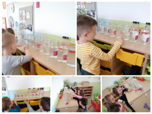 Za ovu aktivnost bile su nam potrebne staklenke, voda i drveni štapić. Djeca, uz pomoć odgojitelja, donosili su u čašama vodu i ulijevali u staklenke. Udaranjem štapića po staklenkama djeca su istraživala,isprobavala, osluškivala različite tonove. Staklenke smo zatim označili slovima glazbene abecede koju djeca već poznaju.