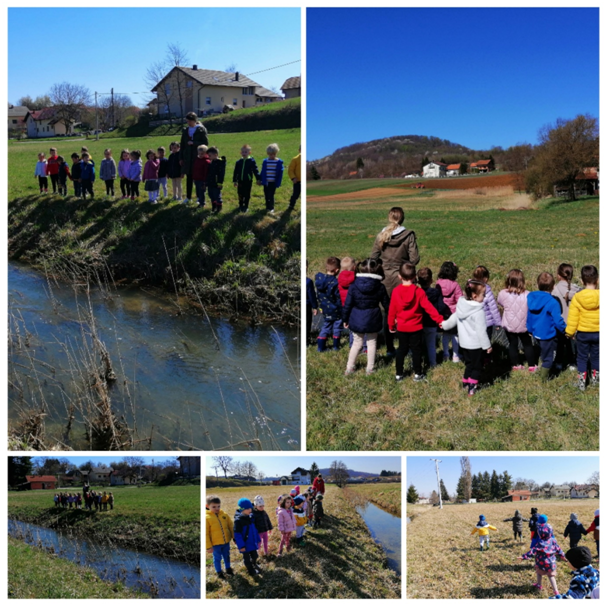 Za ovu aktivnost odabrali smo odlazak u šetnju do obližnjeg potoka. Promatrali smo potok, poticajnim pitanjima navodili djecu da razgovaraju o onome što vide. Osluškivali smo žuborenje potoka, te na kraju zaključili kako u našem potoku ima trave, zemlje i da se naš potok „miče“ (teče).