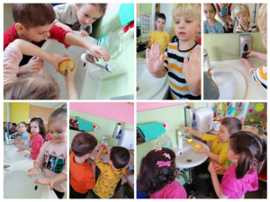 Pranje ruku nekoliko puta na dan, svakodnevica je u našoj skupini. Djeca već dobro znaju zašto je važno prati ruke i kako ih peremo. Uz dobro znanu brigu o vlastitoj higijeni dodali smo i veselu pjesmicu „Sapun voda, je’n, dva, tri, za pranje ruku spremni smo svi“. Djeca najviše vole trljanjem ruku stvarati mjehuriće i pjenicu na svojim rukama, a nakon pranja tražeodgojiteljice da im pomirišu ruke.