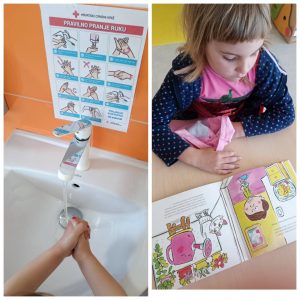 Koliko je važno pravilno pranje ruku za naše zdravlje djeca skupine “Točkice” već dobro znaju. Za to nam služi aplikacija uz koju se povremeno prisjetimo načina pranja ruku. Uz slikovnicu “Zatvori vodu!” iz zbirke edukativnih slikovnica “Spasimo Zemlju!” spoznali smo kako čuvati pitku vodu te zašto je važno zatvarati slavinu odmah poslije korištenja.