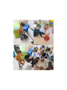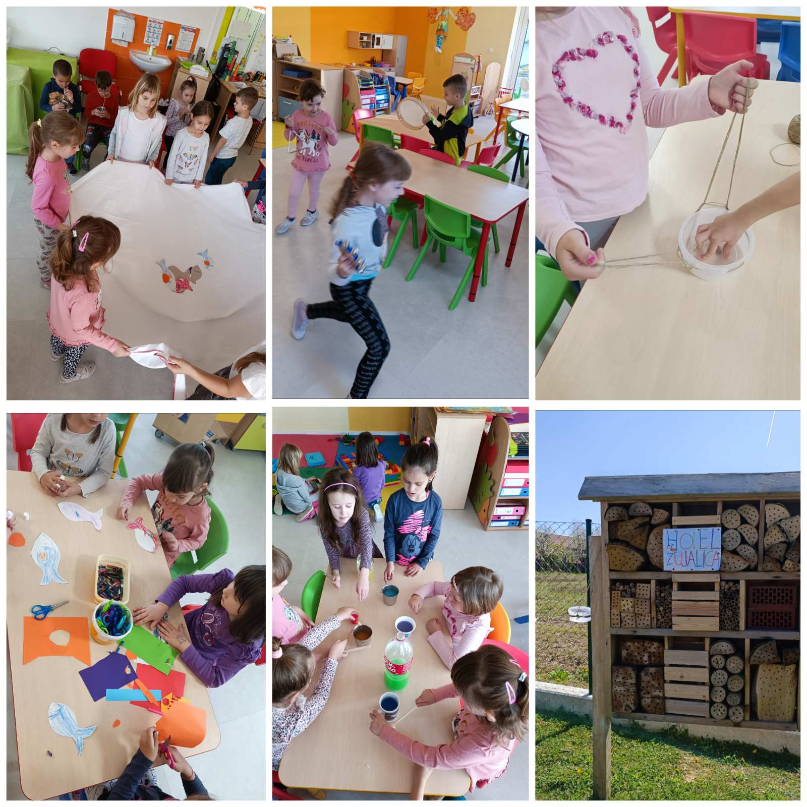 Djeca su za aktivnost VALOVI pripremili ribice od papira te ih ukrasili po vlastitoj želji i stavili ih na platno kojim smo napravili more. Uz pjevanje pjesmice “Hej, ribo ribice” djeca su podizala i spuštala platno i radila valove. Da bi atmosfera bila kao na moru, djeca su u pozadini proizvodila “valove” puhanjem kroz slamku u čašu s vodom. Dok nisu pjevala pjesmu slušala su riječi odgajateljice GORE, DOLJE, VALOVI SE BORE ili LJULJA SE MORE i pratila ih pokretima. Pojedina djeca koja su pratila sa strane igru, pokušala su preplivati valove i boriti se s uzburkanim morem. Uzvikivali smo: “Zaroni!”