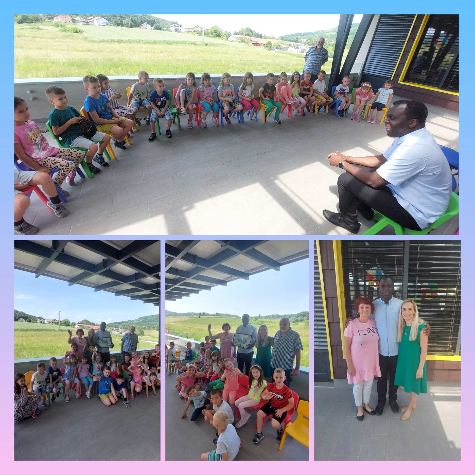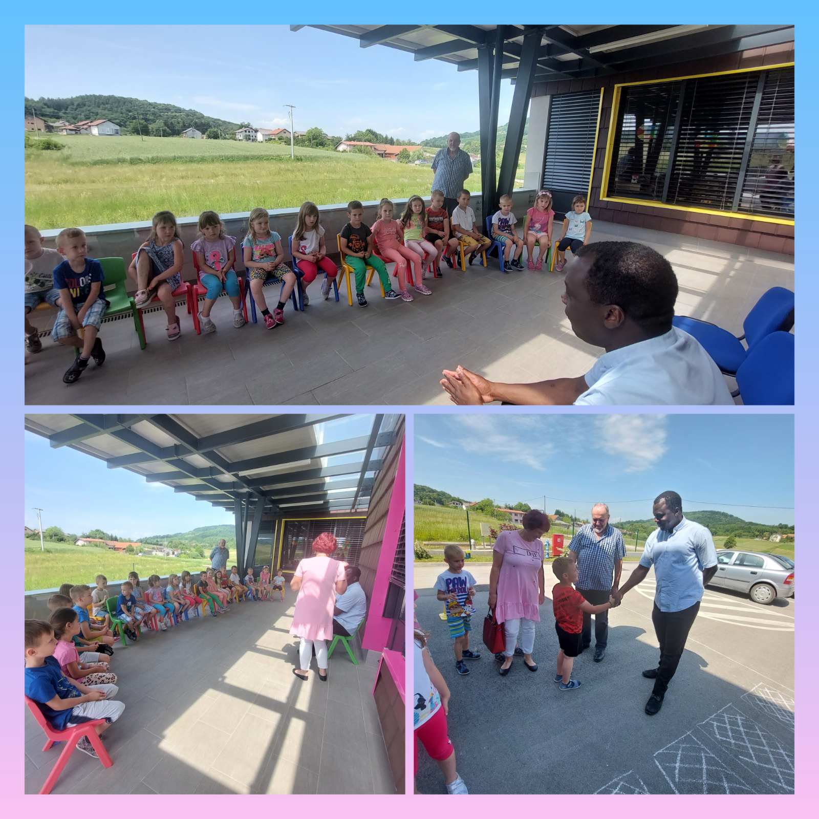 Zahvaljujemo se svim roditeljima odgojnih skupina koji su sudjelovali u humanitarnoj akciji, u kojoj su prigodnom donacijom pomogli radu sirotišta Svetog Ivana Pavla II, (smještenog u selu Hondiji u Africi) doma za djevojčice bez roditeljske skrbi. Donaciju od prikupljenih 848 kuna predali smo velečasnom Odilonu Singbu, svećeniku iz Benina, udaljene afričke zemlje. Velečasni Odilon, pričao nam je o domu za djevojčice kojeg pohađa 30-ak djevojčica u dobi od 6 mjeseci do 18 godina. Na početku razgovora osvrnuo se na naš prekrasni vrtić, te komentirao da bi djevojčice bile presretne da je njihov dom ovakav poput našeg. Upoznao se s djecom, nakon kratkog razgovora, djeca su mu mogla postavljati pitanja. Nakon upoznavanja, predali smo mu sliku na poklon, likovni rad na temu: „Potok“ kao sjećanje na posjet našem vrtiću. Svoj govor završio je riječima, „Lijepo je činiti dobro i biti dobar, onima koje poznajemo i koje ne poznajemo!“