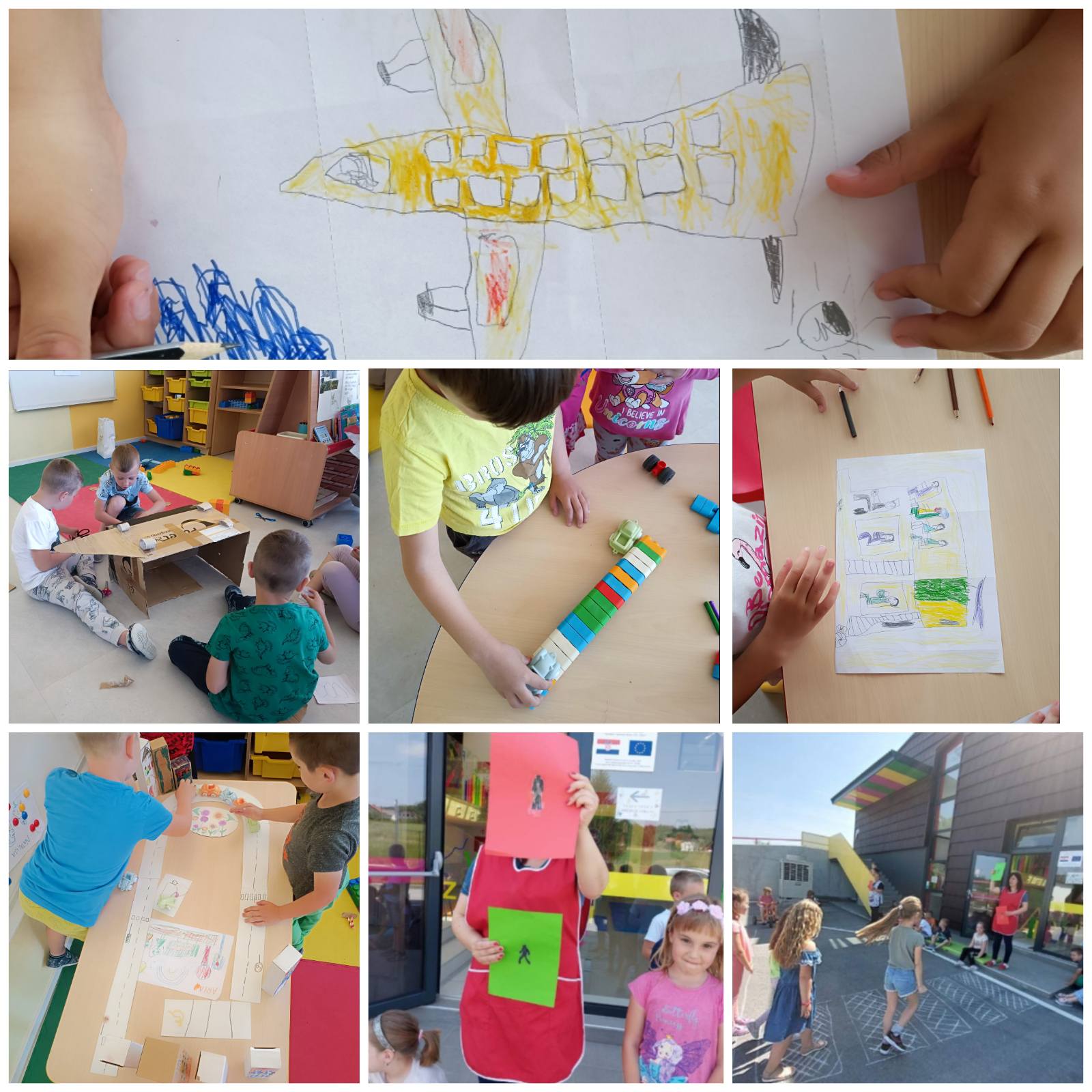 U skupini smo kroz igru odradili aktivnosti vezane za prometni odgoj. Putem društvenih igara s pravilima, zatim slikovnica i videozapisa o prometu kao i dječjih pjesmica, djeca su spoznavala osnovna znanja i vještine potrebne za samostalno snalaženje u prometu. Izradili smo maketu prometnice sa znakovima i vježbali snalaženje u prometu kao pješaci, ali i vozači s autićima. Brzo smo naučili pjesmu “Bicikl” jer svi već znamo voziti bicikl. Likovno smo se izražavali različitim tehnikama i crtali i izrađivali omiljena prijevozna sredstva.
