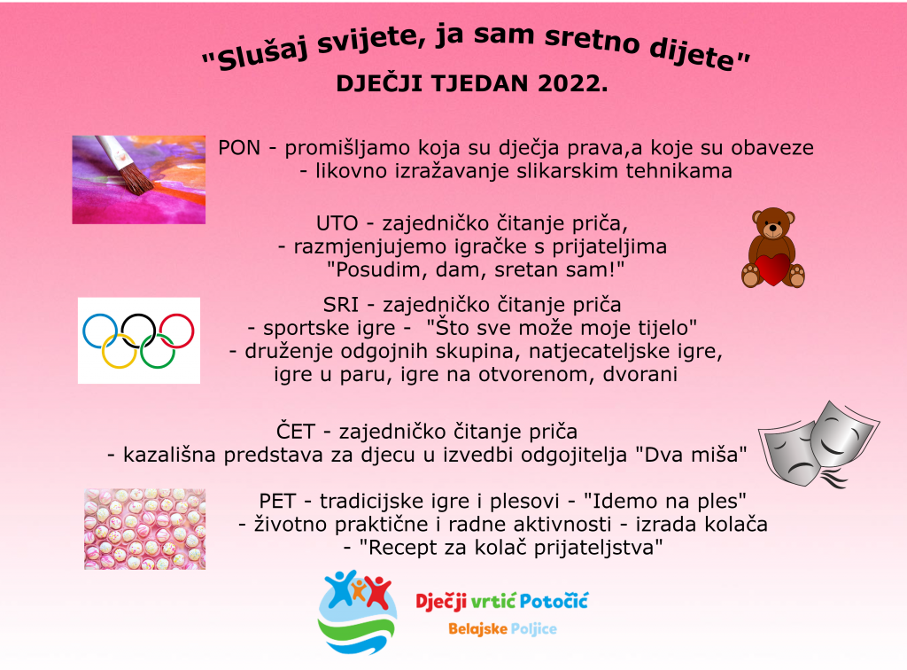 Dječji tjedan je vrijeme naglašavanja važnosti promicanje prava djece koja su garantirana Konvencijom o pravima djeteta kao i vrijeme u kojem osvještavamo zajedničku odgovornost za poštivanje dječjih prava i odgovaranje na potrebe djece.