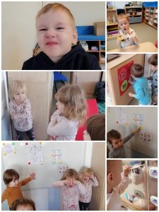 Početkom mjeseca obilježili smo svjetski dan smijeha. S obzirom da su djeca pokazala veliki interes i dugo zadržala pažnju, proširili smo temu „emocije“ na sklop različitih aktivnosti vezanih uz tu tematiku. Cilj nam je da djeca osvijeste i/ili prepoznaju svoje trenutne emocije te emocije ljudi koji ih okružuju. Karakteristike za ovu dob su burne emocionalne reakcije (što smo već i napomenuli) koje dijete često ne može kontrolirati jer ne zna, stoga nam je bitno prema djetetovim potrebama i interesima te mogućnostima, usvojiti kontrolu emocija na prihvatljiv način- što je ujedno i temelj razvoja emocionalne inteligencije. Kroz raznu didaktiku, poticaje te usmjeravanja, djeca su imala priliku osvijestiti mimiku lica pojedine emocije, kasnije i povezujući ih s taktilnim različitostima.