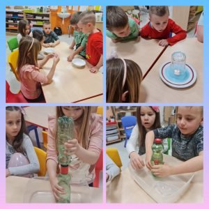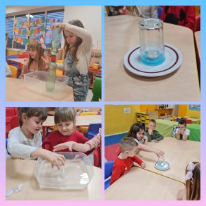 Za početak druženja s profesoricom Danielom naši mali znanstvenici pokušali su napraviti svoj vlastiti vodni vrlog. Naučili su da je razlika tlakova uzrok različitih pojava u prirodi poput vjetrova, pijavica, tornada. Svoju pretpostavku da zrak zauzima prostor u praznoj čaši provjerili su kroz nekoliko pokusa i potvrdili svoju pretpostavku da zrak zauzima prostor, te da tek kad iz čaše izađe zrak voda može ispuniti čašu. Doživjeli su i čaroliju otvaranja papira te saznali od čega se papir izrađuje i kako građa celuloze i ulazak vode u „kapilare“ papira otvaraju papir.