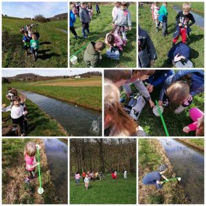 Dolaskom proljeća proširivali smo znanje o važnim karakteristikama tog godišnjeg doba. Na našem kalendaru pratili smo dane u tjednu, pa tako i promjenu godišnjeg doba. Uočavali smo da je trava zelenija, dani su duži, topliji i sunčaniji. Zazujale su prvi bumbari i pčelice, pojavili se leptiri, pojavio se poneki maslačak i tratinčica. Posebnu važnost pridodali smo vodi povodom obilježavanja Svjetskog dana vode. Otišli smo do potočića koji se nalazi u neposrednoj blizini našeg vrtića. Osluškivali smo kako žubori, uočavali smo i donosili zaključke o tome da li je potok čist, bistar, ima li u njemu riba. Uzimali smo uzorak (kapljice) potoka kako bismo ga promatrali pod mikroskopom, što je djecu posebno zainteresiralo. Isto tako, ponovili smo u kojim se sve oblicima voda može naći, te smo istraživali što u vodi pliva, a što tone.
