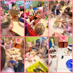 Tako smo krenuli raditi našu maketu farme u sobi dnevnog boravka. Znamo da svako seosko imanje ima štalu pa smo tako i mi krenuli raditi „kućicu“ za životinje, nastavili smo sa izradom silosa gdje stoji hrana, zatim ogradom te smo na kraju postavili i životinjice koje su nam neki donijeli od kuće.