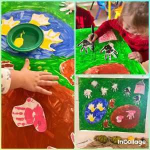 Odradili smo i likovnu aktivnost koja nam se provukla preko nekoliko dana a to je bio veliki zajednički rad naše farme. Temperama su djeca oslikavala podlogu, oslikavali su svoje ručice i njima ostavljali otiske koje smo pretvorili u životinje, lijepili smo vatu te flomasterima ocrtavali ogradu.