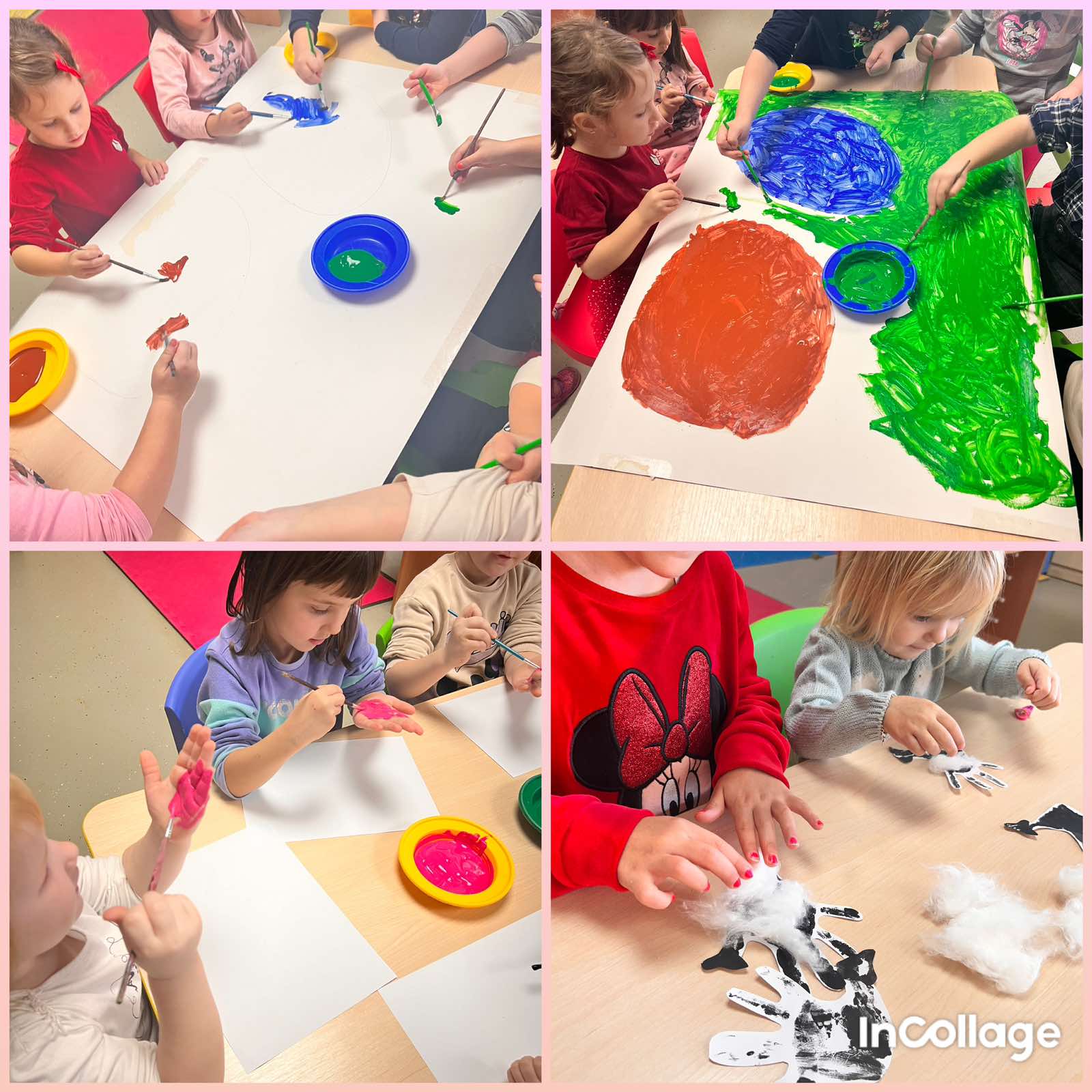 Odradili smo i likovnu aktivnost koja nam se provukla preko nekoliko dana a to je bio veliki zajednički rad naše farme. Temperama su djeca oslikavala podlogu, oslikavali su svoje ručice i njima ostavljali otiske koje smo pretvorili u životinje, lijepili smo vatu te flomasterima ocrtavali ogradu.