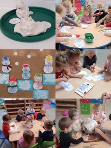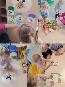 Nizanje pahuljica na prozor popratili smo pjesmicom “Padaj, padaj snježiću”, a likovnu aktivnost kaširanja snjegovića popratili smo pjesmom “Bijeli snješko”. Ali, da bi usvojili pjesmice najprije smo puhali kao vjetar u pahuljice od krep papira. Zatim, igru zamišljanja upotpunili smo bacanjem balona u zrak i promatrali kako se spuštaju na tlo uz zvukove Vivaldijeve “Zime” Djecu je muzika potaknula na pokret pa su plesala poput malih pahuljica, dizala se i spuštala, kotrljala po podu, poskakivala s jedne noge na drugu, širila ručice kao da čekaju pahuljicu da im se spusti na dlan, vrtjela se po prostoru sobe dnevnog boravka samostalno ili u paru. Našem veselju i igri nije bilo kraja.