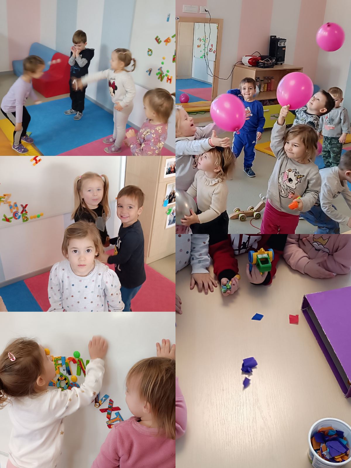 Nizanje pahuljica na prozor popratili smo pjesmicom “Padaj, padaj snježiću”, a likovnu aktivnost kaširanja snjegovića popratili smo pjesmom “Bijeli snješko”. Ali, da bi usvojili pjesmice najprije smo puhali kao vjetar u pahuljice od krep papira. Zatim, igru zamišljanja upotpunili smo bacanjem balona u zrak i promatrali kako se spuštaju na tlo uz zvukove Vivaldijeve “Zime” Djecu je muzika potaknula na pokret pa su plesala poput malih pahuljica, dizala se i spuštala, kotrljala po podu, poskakivala s jedne noge na drugu, širila ručice kao da čekaju pahuljicu da im se spusti na dlan, vrtjela se po prostoru sobe dnevnog boravka samostalno ili u paru. Našem veselju i igri nije bilo kraja.