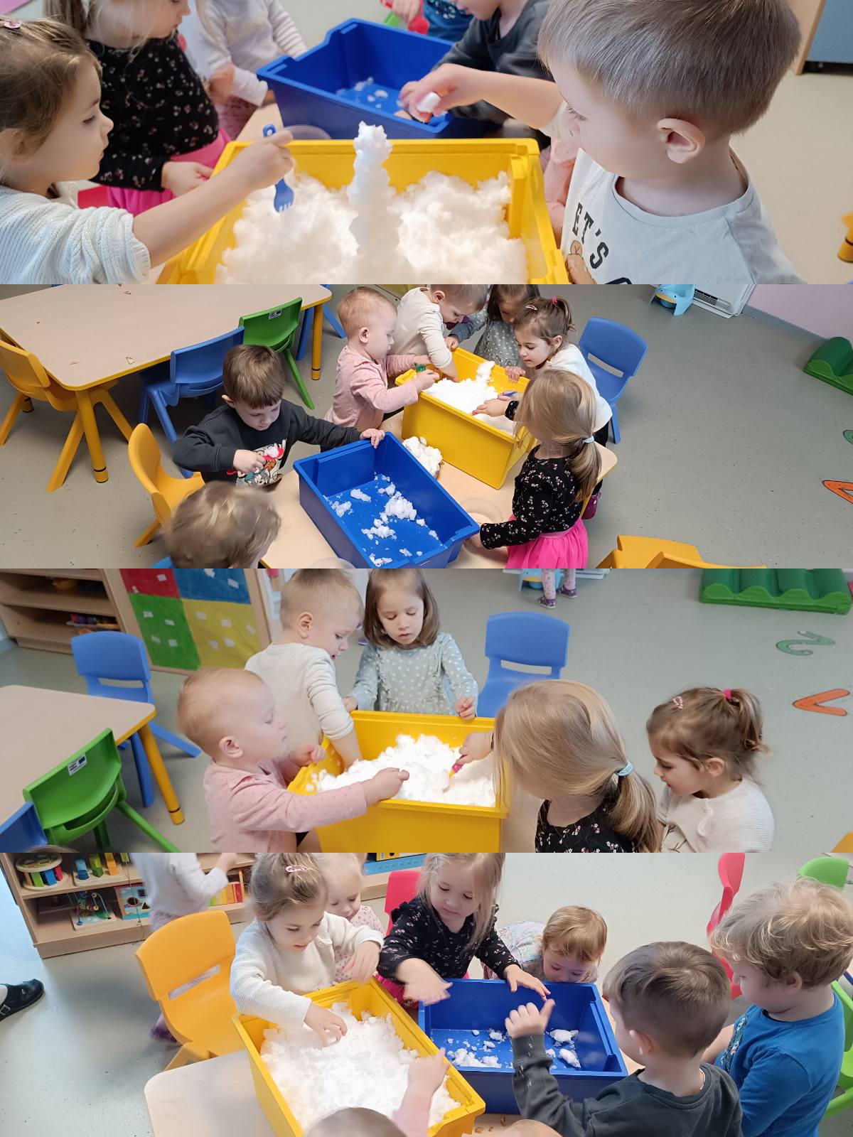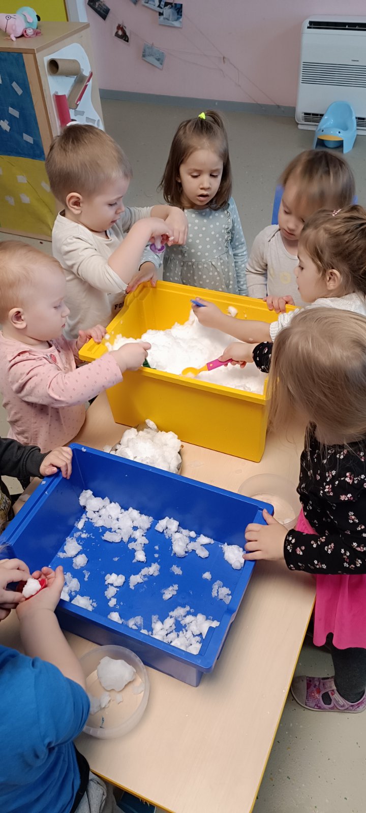 Tako nastaje i naša istraživačka aktivnost u kojoj promatramo agregatna stanja vode. Sakupljamo snijeg u posude i donosimo ga u našu sobu dnevnig boravka. Djeca istražuju snijeg osjetilom dodira i njuha, sa plastičnim žličicama, stavljaju ga u čašice, oblikuju ga u male grude sve dok se na sobnoj temperaturi snijeg ne počne polako topiti.