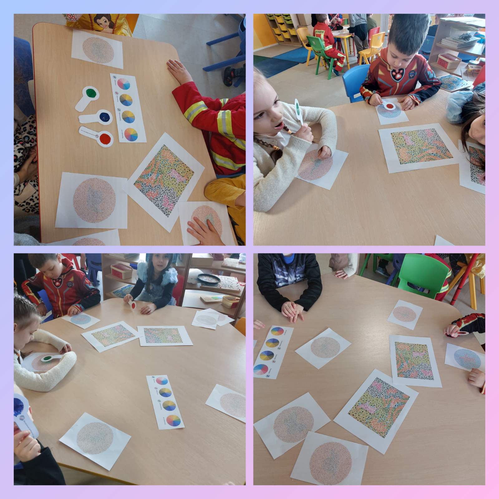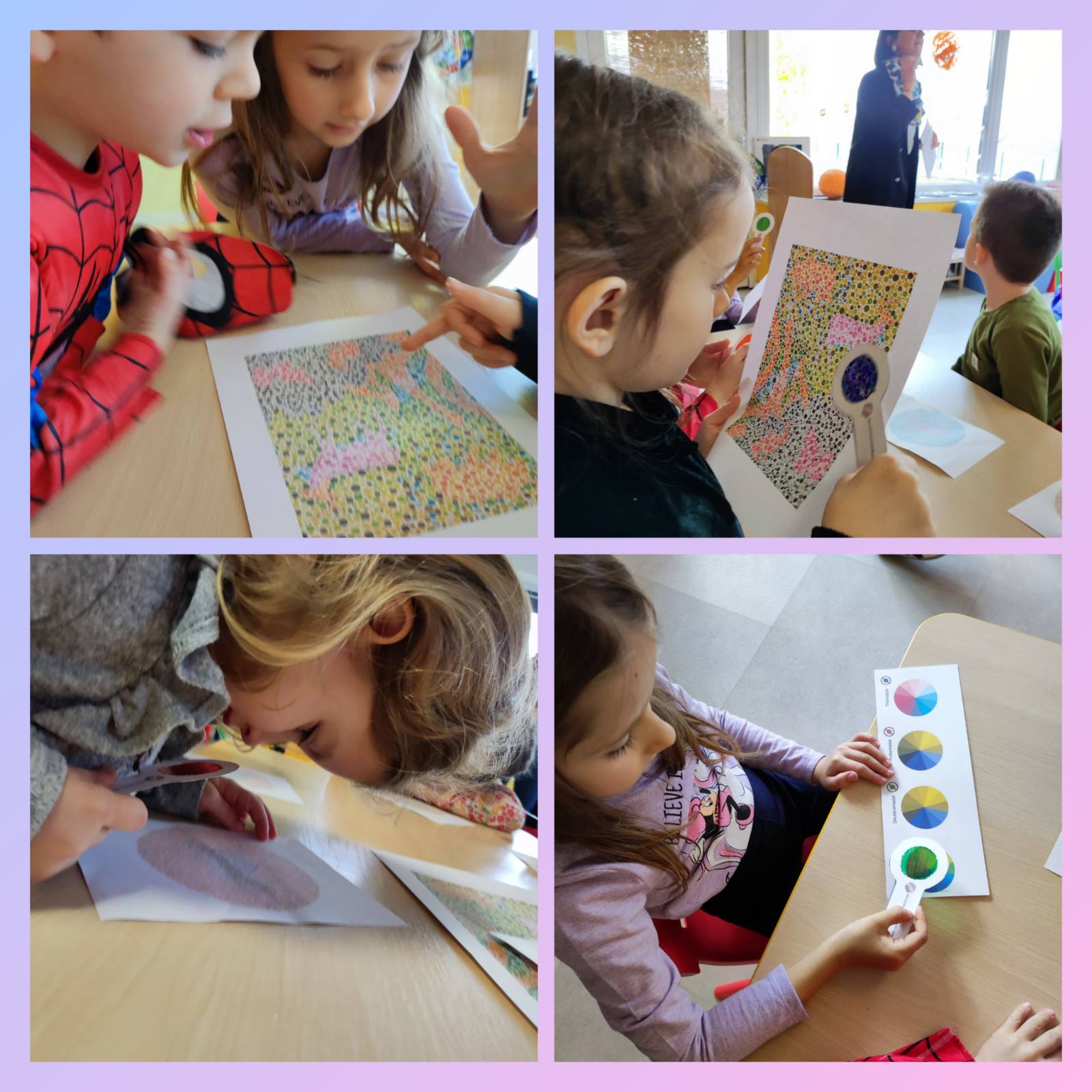 Tijekom novog STEAM druženja naši Puzzlići nastavili su s temom oka, točnije pokušali su odgovoriti na pitanje „Vidimo li svi sve boje jednako?“. Na početku druženja prisjetili su se onoga što su ranije saznali o oku i o području oka koje nam omogućuje percepciju boja, odnosno o mrežnici. Prisjetili su se da su u mrežnici smješteni receptori za svjetlost i boju koje nazivamo čunjići i štapići. Kroz uvodnu motivacijsku priču saznali su da čunjići i štapići pretvaraju vidljive svjetlosti u električne signale koji se putem vidnog živca prenose do mozga.