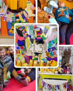 Ovaj mjesec obilježili smo i Svjetski dan osoba s Down sindromom 21. ožujka kroz različite aktivnosti koje su poticale svijest o važnosti prihvaćanja različitosti. Posvetili smo dan nošenju šarenih čarapa, simbola Down sindroma te smo razgovarali o tome i gledali edukativne sadržaje. Posljednja aktivnost tog dana bila je slušanje audio slikovnice na platformi youtube pod nazivom „Moja prijateljica ima Down sindrom“. Nakon slušanja slikovnice impresiju poslušanog djeca su prenijela na papir nacrtavši dio slikovnice koji ih se najviše dojmio.