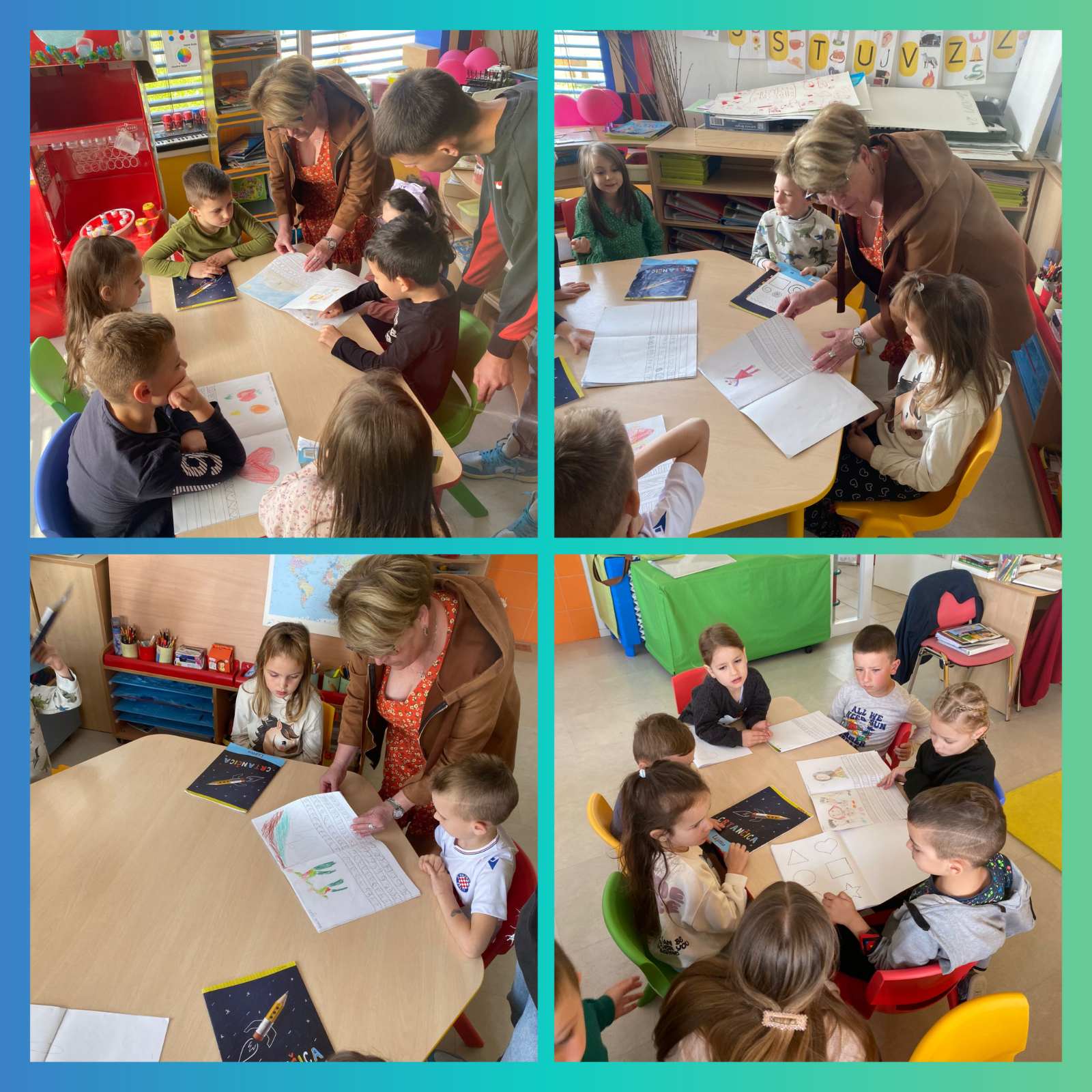Učiteljica je predstavila djeci svoj rad i aktivnosti, iako su se već susreli s njom prilikom upisa u školu. Djeca su pokazala svoje radne listiće i crteže, postavljala pitanja te uživala u kratkom druženju s učiteljicom.