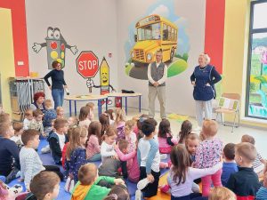 Gospodin Nikola ispričao nam je što je sve potrebno za vožnju bibliobusa. Iz svoje jakne sa puno džepova vadio je i pokazivao razne predmete. Tako se tu našlo nekoliko mobitela, ključeva, vozačka dozvola, sunčane naočale, rukavice. Djeca su ga pratila u potpunoj tišini i sa velikim zanimanjem.