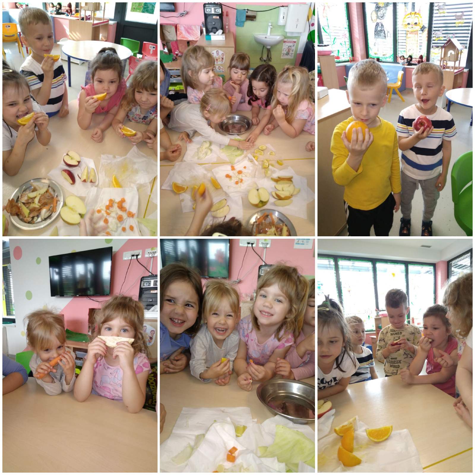 U istraživačko spoznajnim aktivnostima u vrećici iznenađenja tražili smo voće i povrće. Opisali smo boju, oblik i miris, a zatim probali te uspoređivali okuse: slano, slatko, gorko, kiselo.