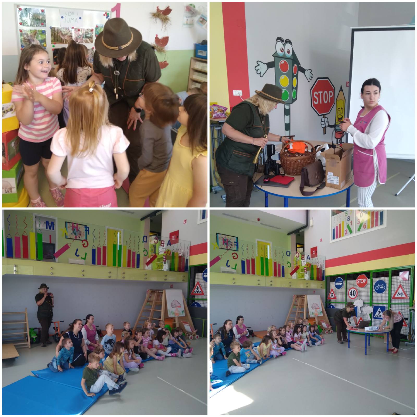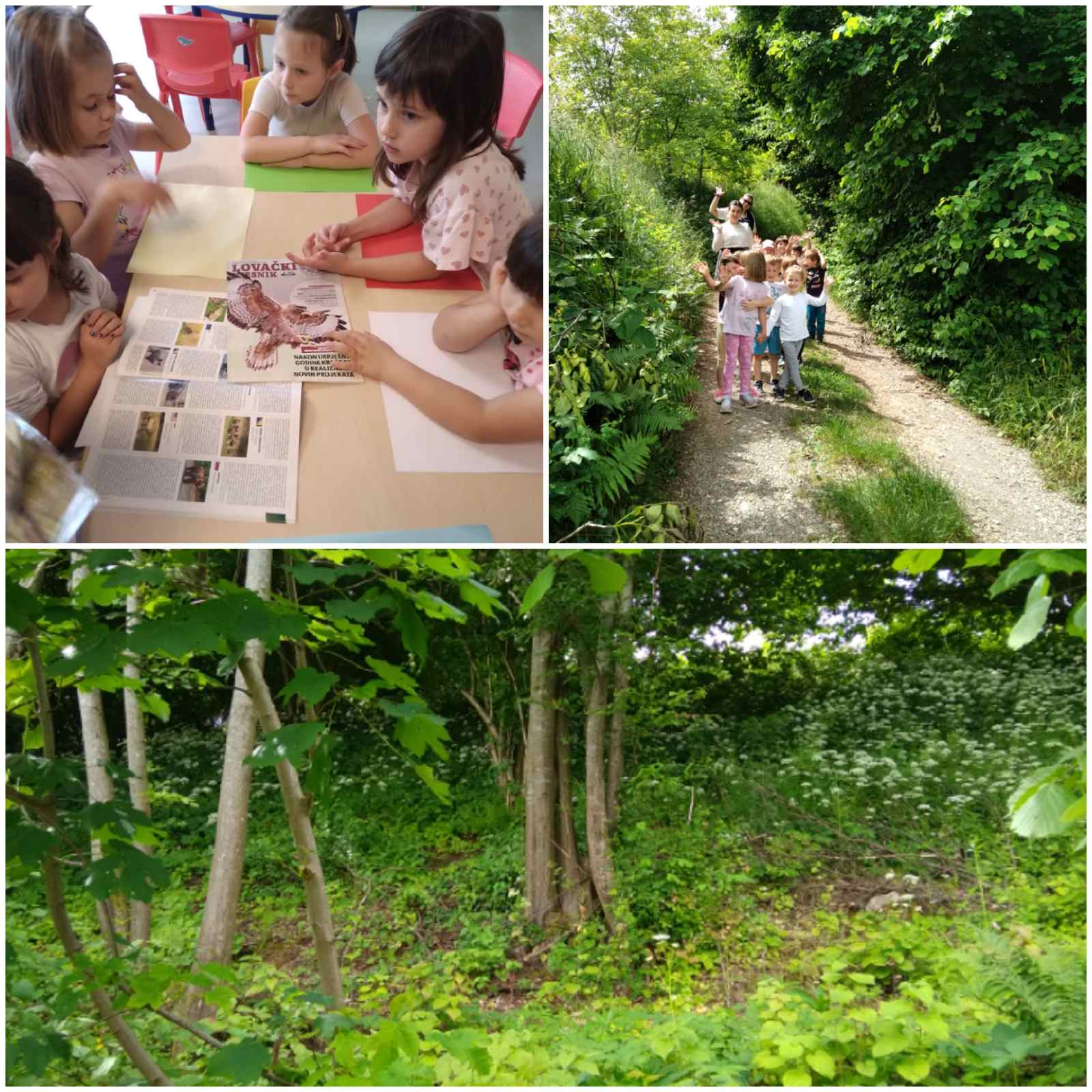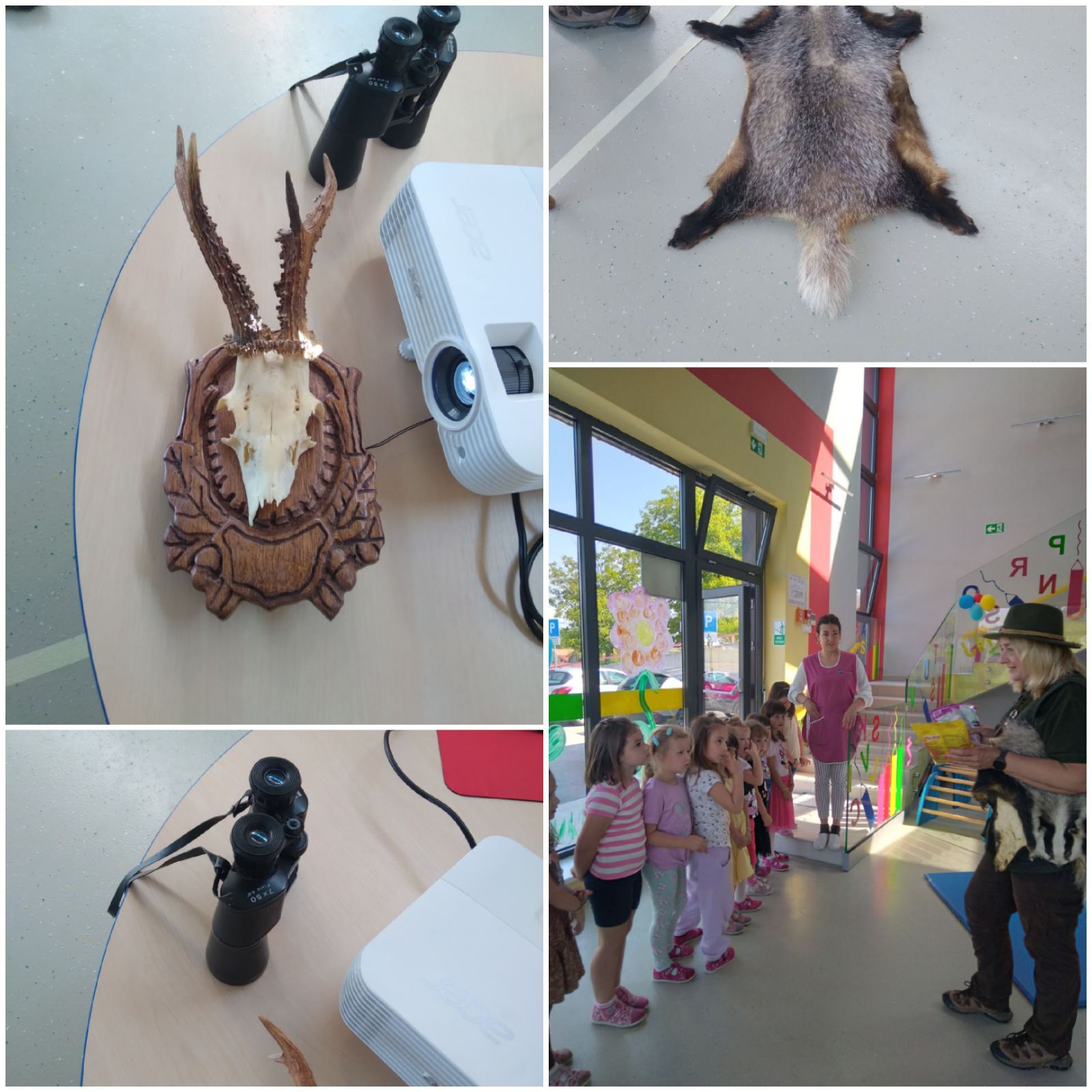 Kako cijelu godinu radimo na projektu „Seosko gospodarstvo“, Tena nam je donijela lovačke časopise. Odlučili smo u posjet pozvati pravoga lovca. Dogovorili smo posjet s lovkinjom Adrianom Radočaj. Tijekom ovoga tjedna provodili smo aktivnosti vezane uz lov i šumu. Lovkinja Adriana prezentirala nam je predmete koje lovci koriste tijekom boravka u šumi. Neki od njih su: dalekozor, narančasti prsluk koji služi da bi lovca bolje uočili u šumi, te čeka koja služi za dozivanje i osmatranje životinja. Lovkinja Adriana pokazala nam je kako se glasa jelen te kako ga mi možemo oponašati i dozvati pomoću travke. Imali smo priliku vidjeti kožu jazavca, a posebnu pažnju privukli su zubi divlje svinje. Pogledali smo kratki film sa fotografijama životinja u divljini i prekrasnih prirodnih ljepota. Saznali smo kako lovci ne love samo životinje već ih hrane i brinu se o njima. Nakon dječjih pitanja može li svatko imati pušku lovkinja Adriana objasnila nam je da ne može već osoba mora proći lovački ispit te dobiti važeću lovačku dozvolu. Kako bi lov bio još bolji tu su i lovački psi uvijek spremni za pronalaženje divljači. Djeci su bili posebno zanimljivi rogovi jelena raznih veličina. Oni također mogu služiti kao suvenir svakoga lovca te divna uspomena na vrijeme provedeno u šumi. Našoj lovkinji poklonili smo album sa našim crtežima. druženje smo priveli kraju zajedničkom fotografijom.
