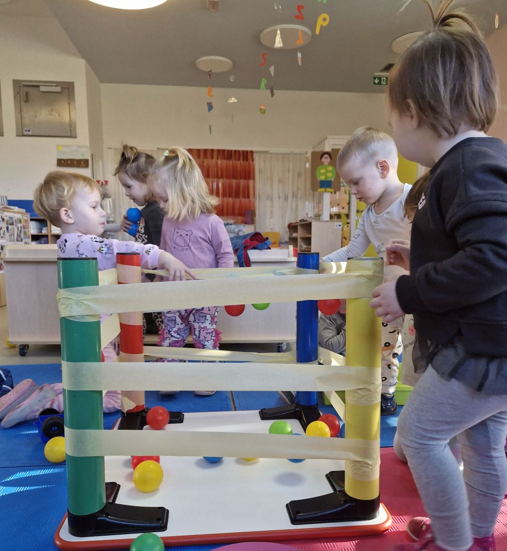 Loptama smo pokušavali pogoditi pik traku koju su odgojiteljice zalijepile za stol. To nam je bio veliki izazov, pa smo loptice bacali unutar ograđenog polja i gledali kako se lopte provlače ispod zalijepljene trake. Oduševilo nas je kako se lopte daju zalijepiti za stol!