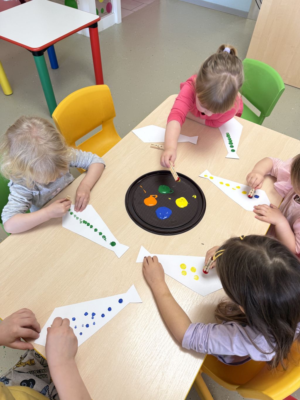 Cijeli je mjesec protekao i u pripremama za proljeće. Prvo smo ukrasili prozore u našoj sobi. Nacrtali smo cvijeće na način da smo prvo ruku stavili u temperu te smo otiskivali prozor. Uz pomoć temperama obojanih papirnatih tanjura izradili smo cvjetove koje smo zalijepili na prozor. Pomoću vilica i žute tempere izradili smo latice tulipana, a zatim dodali stabljiku zelenim flomasterom. Zumbule smo izradili pomoću snopa štapića za uši koji su bili povezani gumicom i umočenih u ljubičastu temperu te otiskivanjem ostavljali otisak sličan zumbulu. Od ostataka stiropora izradili smo i hranilicu za ptice. Bojali smo papire vodenim bojama te od toga izrađivali leptire koje smo izvjesili pokraj ulaznih vrata naše sobe. A na predložak oblaka smo zalijepili vatu koju smo obojali špricanjem tempere pomiješane sa vodom.