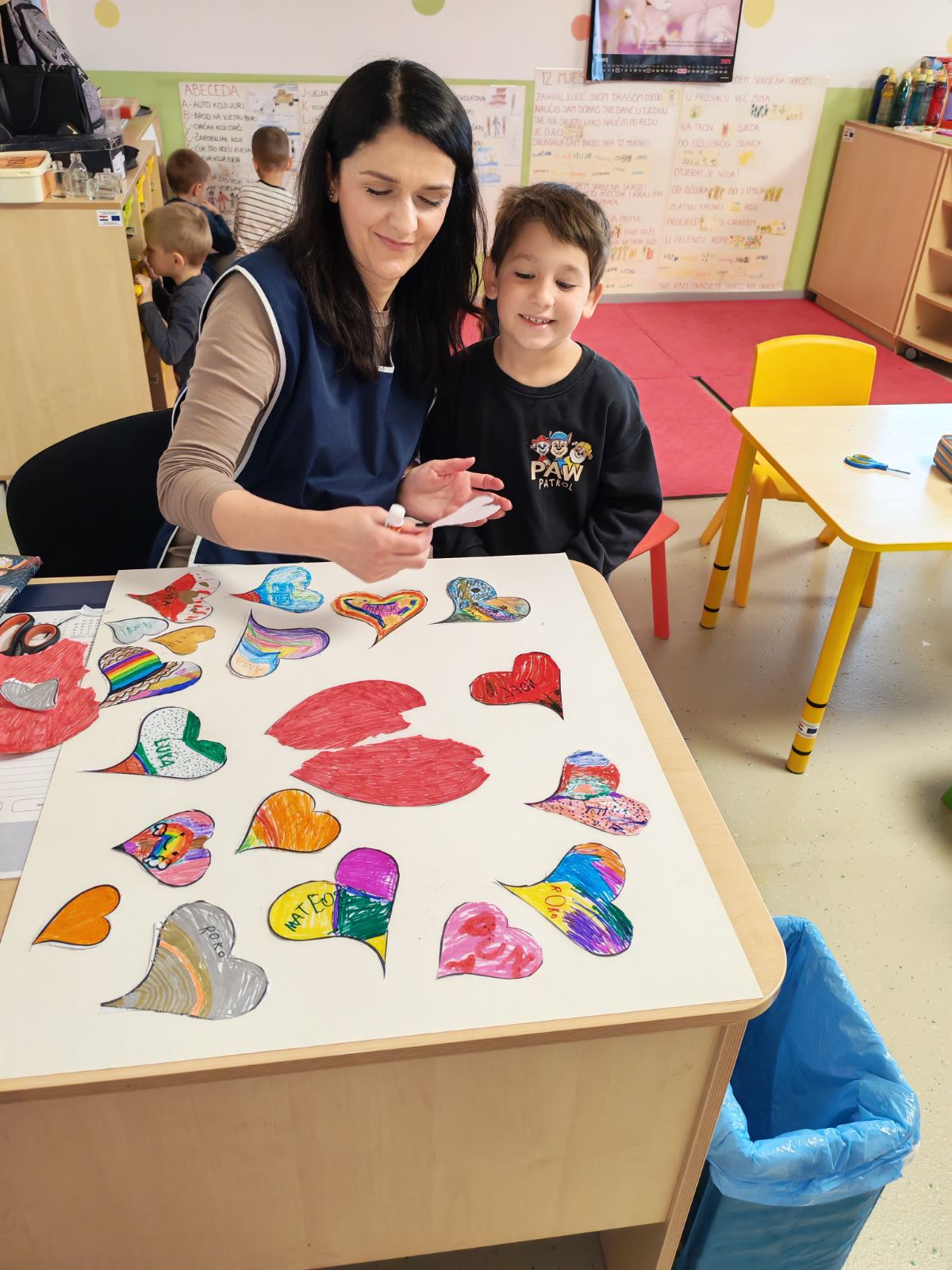 Kroz kreativni dio „Topla riječ u srcu“, djeca su ukrašavala papirnata srca, koja su simbolizirala dobrotu i lijepe riječi. Svako srce nosilo je ime djeteta, čime smo dodatno naglasili važnost osobne vrijednosti i pripadnosti skupini.